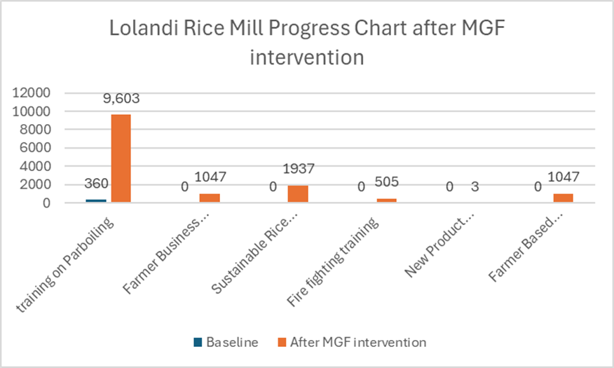 The bar chart above illustrates the progress of Lolandi Rice mill from baseline to the MGF intervention.